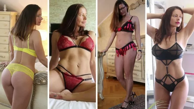Babe trying on bra panties & lingerie at nudist resort before grabbing vibrator for stand-up masturbating orgasm - Lelu Love